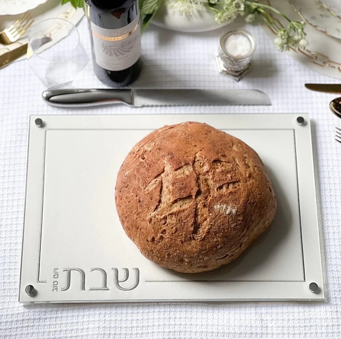 This quality challah board is a three-layer masterpiece. The sheet of high quality embroidered leatherette lays on a durable lucite material and is topped with scratch-free glass. Elegance redefined.